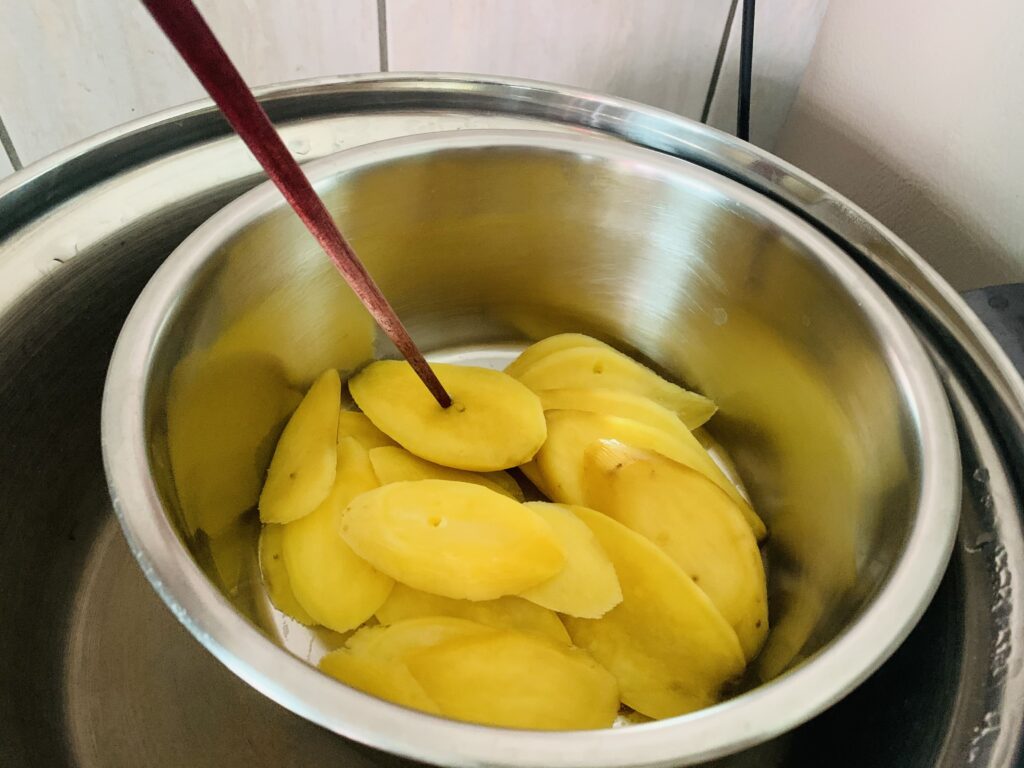 地瓜切片是為了等等放進電鍋中讓地瓜比較快蒸熟